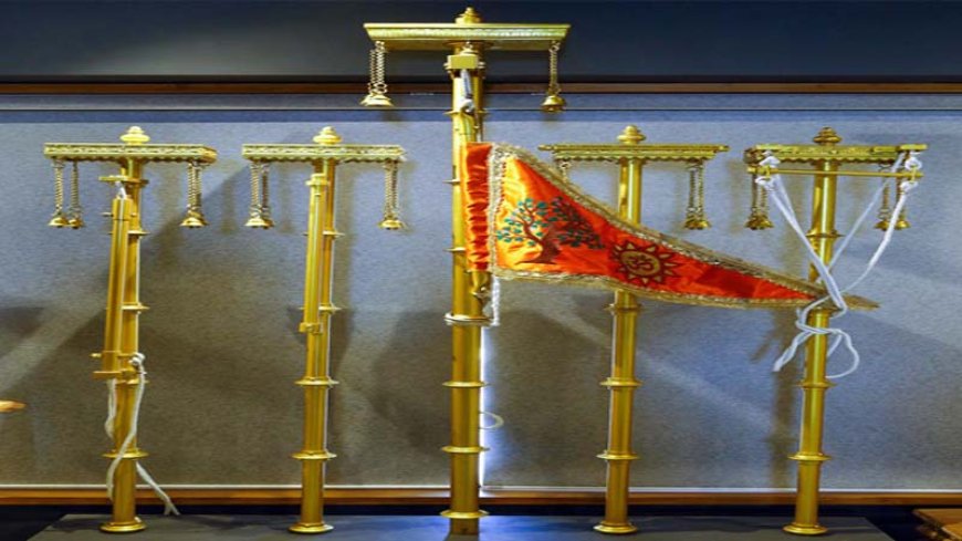 यह भगवा ध्वज तीन पवित्र प्रतीकों से सुसज्जित है, जिन्हें सुनहरे धागे से हाथ से कढ़ाई किया गया है—