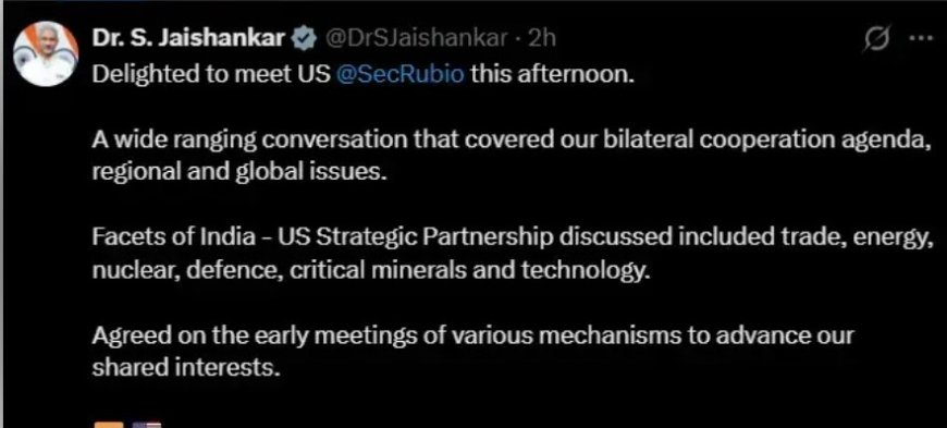 विदेश मंत्री जयशंकर ने अपनी पोस्ट में कहा कि मार्को रुबियो के साथ हुई बैठक में भारत–अमेरिका रणनीतिक साझेदारी के कई महत्वपूर्ण पहलुओं पर जोर दिया गया। इनमें व्यापार, ऊर्जा, परमाणु सहयोग, रक्षा, क्रिटिकल मिनरल्स और प्रौद्योगिकी जैसे क्षेत्र शामिल हैं। उन्होंने यह भी संकेत दिया कि साझा हितों को आगे बढ़ाने के लिए दोनों देशों के राजनयिक तंत्रों के बीच जल्द ही विभिन्न स्तरों पर लगातार बैठकें हो सकती हैं।