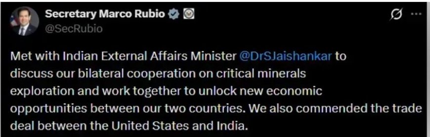 इसके तुरंत बाद अमेरिकी विदेश मंत्री मार्को रुबियो ने भी जयशंकर के साथ अपनी मुलाकात की तस्वीरें साझा कीं और बताया कि दोनों पक्षों ने क्रिटिकल मिनरल्स की खोज और आपूर्ति में द्विपक्षीय सहयोग पर चर्चा की। रुबियो ने कहा कि दोनों देशों के बीच नई आर्थिक संभावनाओं को खोलने के लिए साथ मिलकर काम करने की गुंजाइश है। उन्होंने यह भी कहा, “हमने अमेरिका और भारत के बीच हुए व्यापार समझौते की सराहना की।”