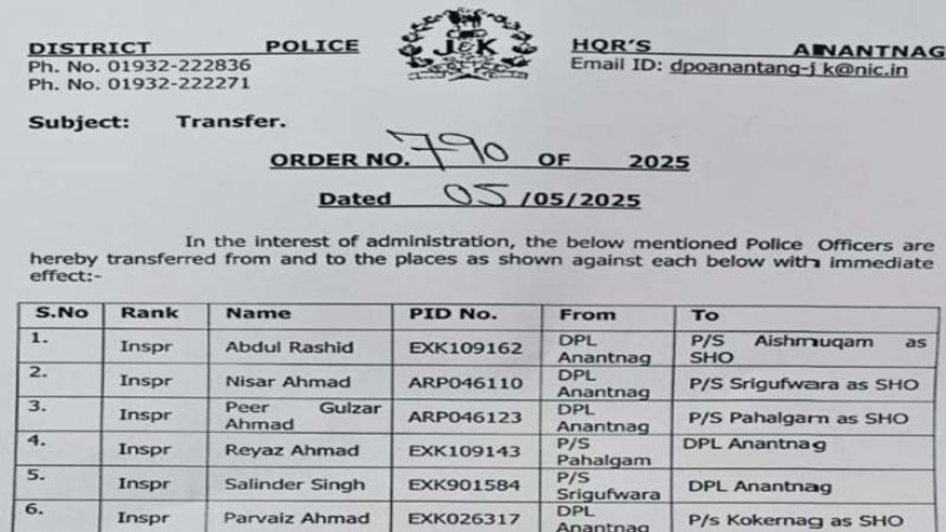 तबादले के तहत मौजूदा SHO रियाज़ अहमद को जिला पुलिस लाइन, अनंतनाग भेजा गया है, जबकि पीर गुलज़ार अहमद को नया पहल्गाम SHO नियुक्त किया गया है।